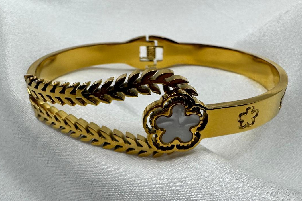 Impactante bangle de acero inoxidable con chapado en oro, incorpora diseño estructurado que aporta fuerza y presencia. Medidas: 6 cm de diámetro y 0.7 cm de ancho, resistente al agua e hipoalergénico. El compañero perfecto para quienes buscan hacer una entrada memorable.