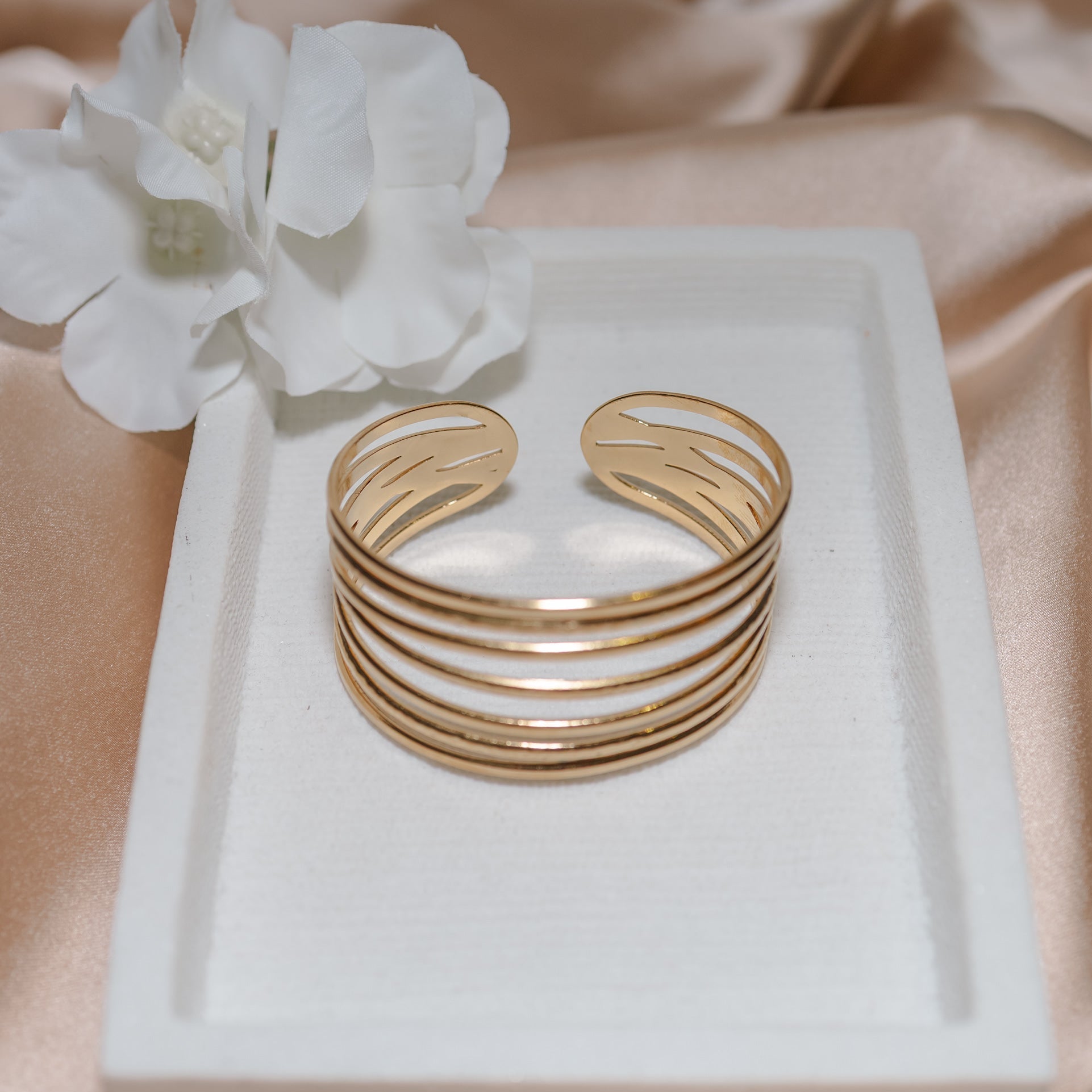 Hermoso bangle de acero inoxidable con excelencia y refinado chapado en oro, incorpora presencia imponente que hace una declaración sin palabras con carácter decidido. Medidas: 5.5 cm de diámetro y 2 cm de ancho, resistente al agua e hipoalergénico. La compañera perfecta para quienes buscan una declaración de impacto visual garantizado.