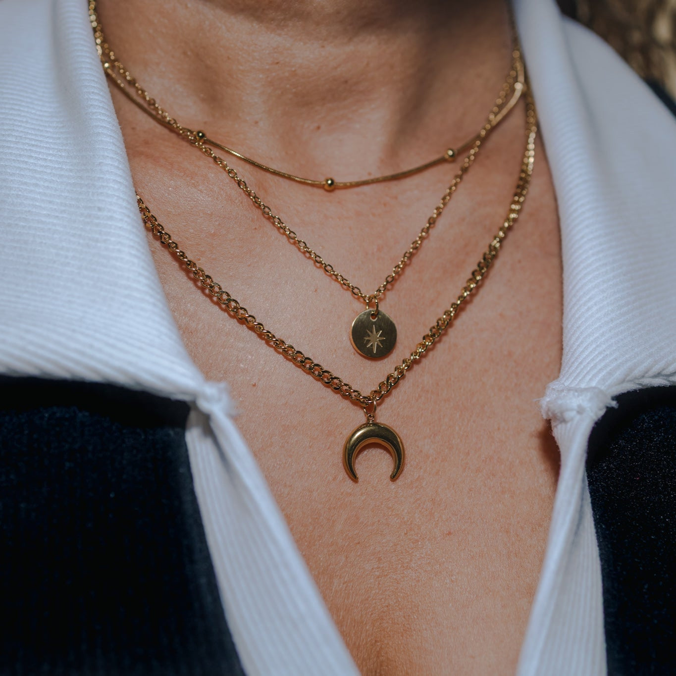Collar de acero inoxidable con excelencia y refinado chapado en oro, incorpora capas múltiples que crean dimensión perfecta. Medidas: (41/45/50)+extensión de 5 cm y dos colgantes de 1.2x1.2 cm y 1.3x1.3 cm, resistente al agua e hipoalergénico. El compañero perfecto para quienes buscan una declaración de presencia imponente.