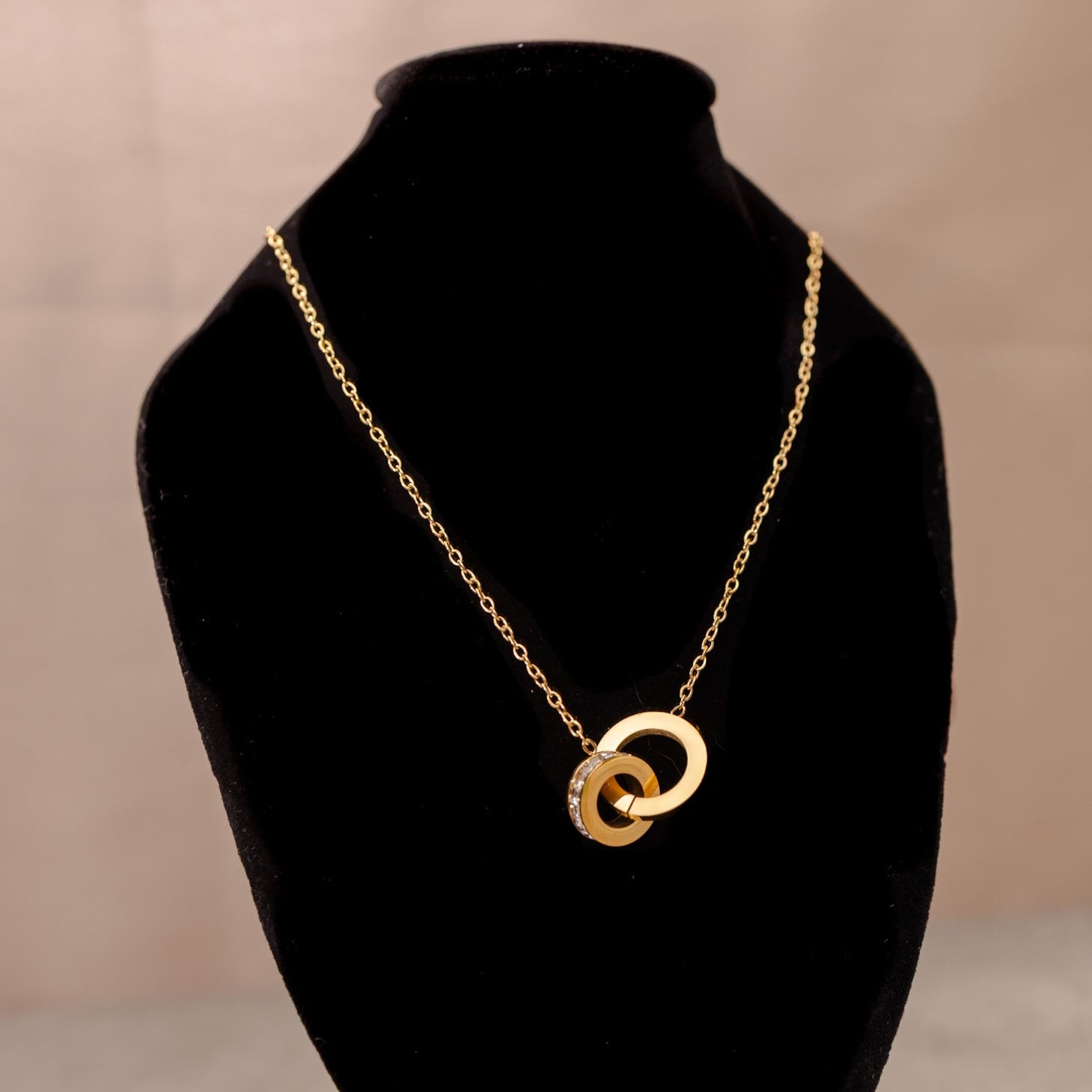 Hermoso collar de acero inoxidable con excelencia y refinado chapado en oro, incorpora detalles brillantes que capturan la luz con elegancia sutil. Medida: 41 cm + extensión de 5 cm y colgante de 1.5 x 1.3 cm. Resistente al agua e hipoalergénico. El compañero perfecto para quienes buscan una declaración de claridad luminosa.