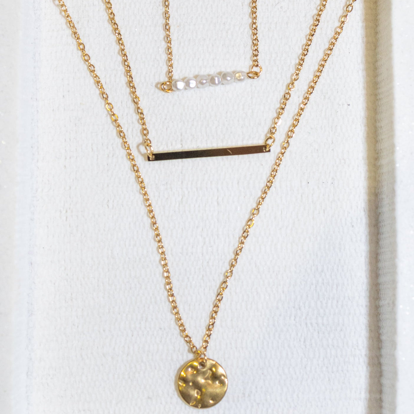 Hermoso collar de capas de acero inoxidable con excelencia y refinado chapado en oro, incorpora tres longitudes que crean dimensión perfecta y versatilidad única. Medidas: (40/46.5/59.5) + 5 cm de extensión y colgantes de 3 x 0.3 cm y 1.0 x 1.0 cm, resistente al agua e hipoalergénico. El compañero perfecto para quienes buscan una declaración de gracia sofisticada.