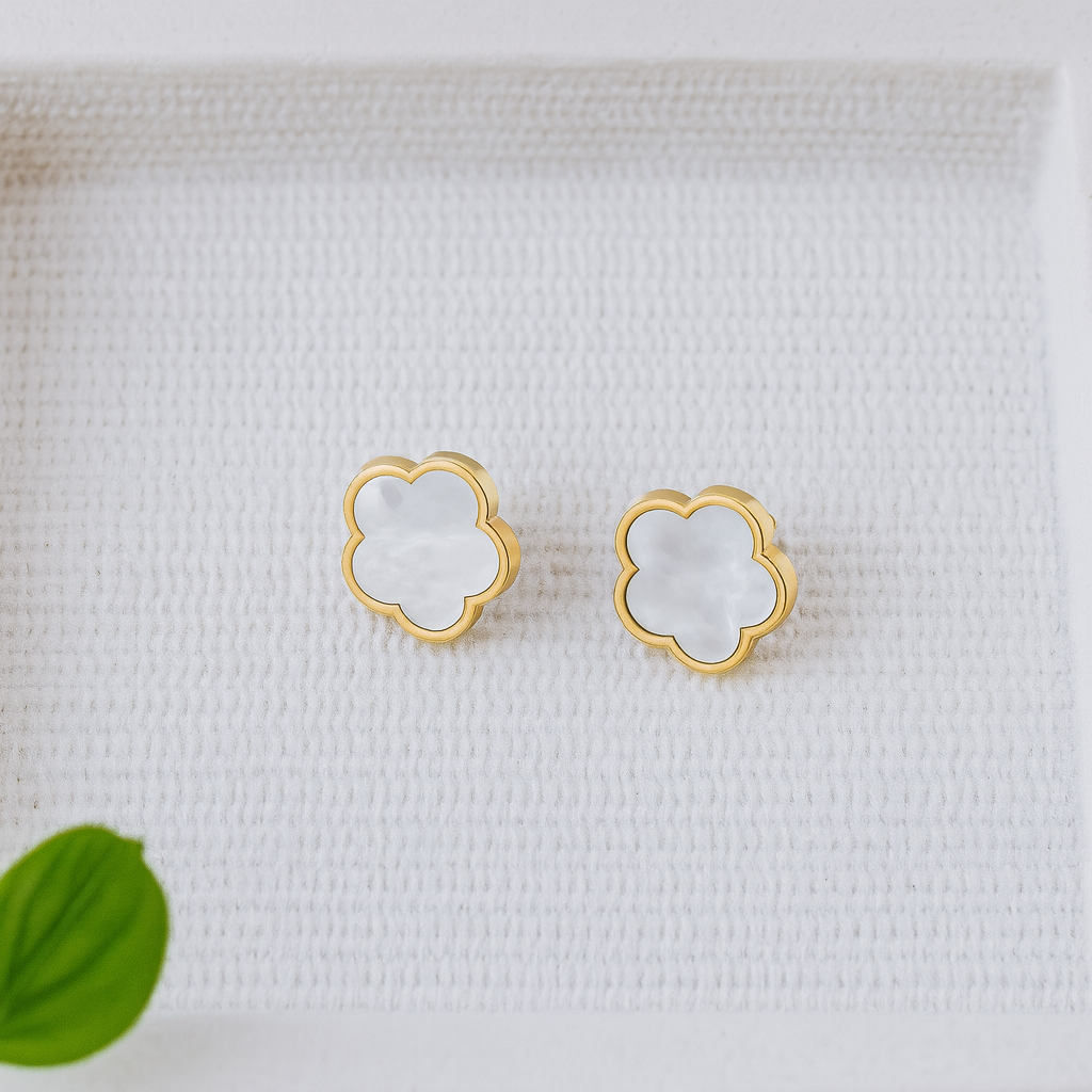Pantallas de acero inoxidable de 1.3 x 1.3 cm con chapado dorado y diseño minimalista. Resistente al agua, hipoalergénico, acabado duradero que no se oxida. La compañera perfecta para quienes buscan simplicidad con sofisticación atemporal.