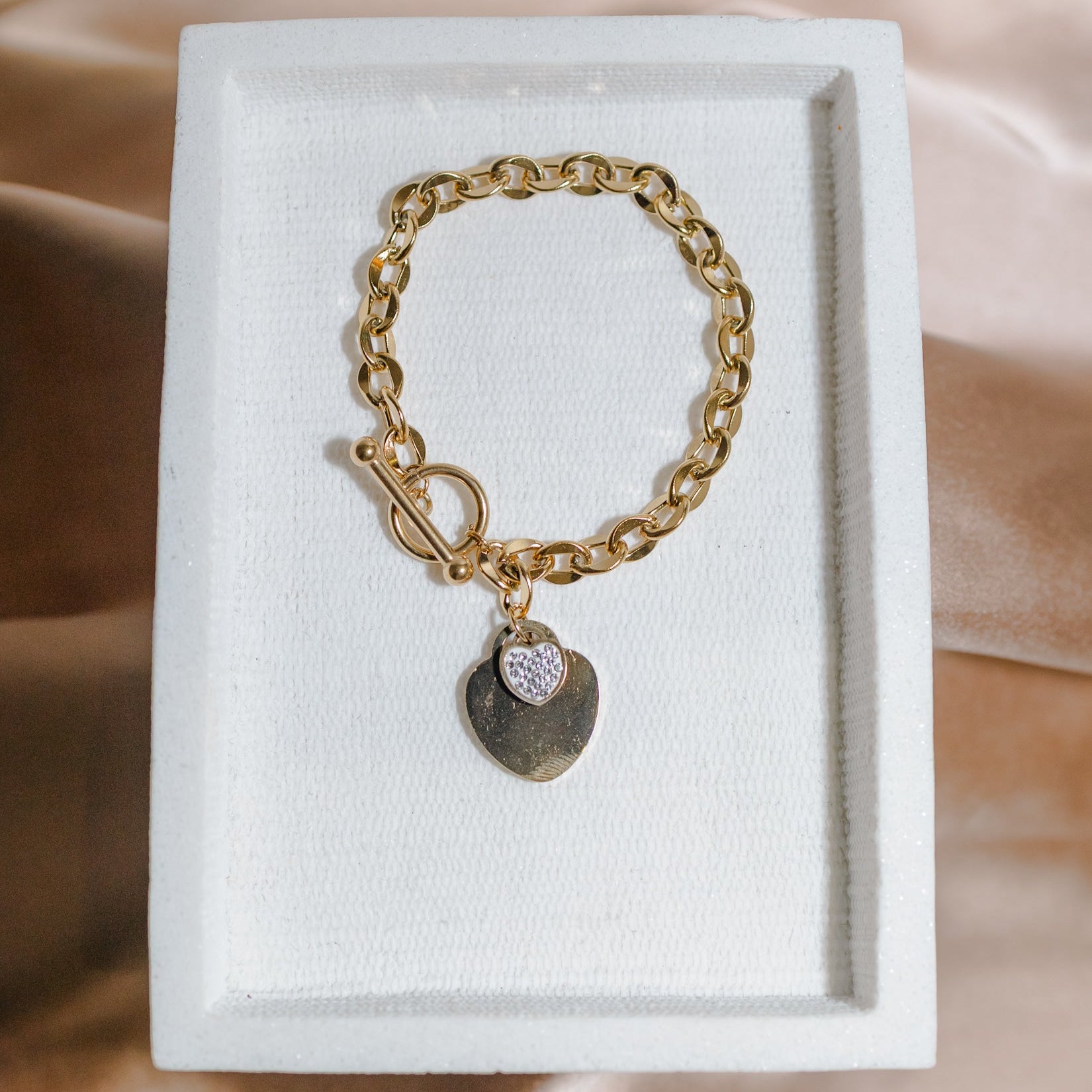 Pulsera elegante con detalles brillantes que añaden un toque especial a cualquier look. Fabricada en acero inoxidable con chapado en oro. Medidas: 17 cm de longitud y 0.6 cm de ancho. Las circonitas cúbicas crean destellos delicados que llaman la atención sin ser excesivos. Resistente al agua e hipoalergénica, perfecta para quienes buscan elegancia con un toque de glamour.