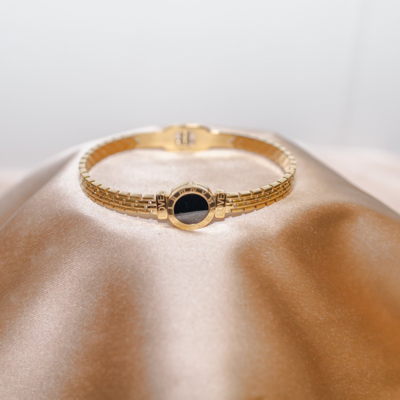 Hermosa pulsera de acero inoxidable con excelencia y refinado chapado en oro, incorpora diseño sólido que abraza tu muñeca con elegancia sofisticada. Medidas: 6.5 cm de diámetro y 0.6 cm de ancho, resistente al agua e hipoalergénico. La compañera perfecta para quienes buscan una declaración de lujo accesible.