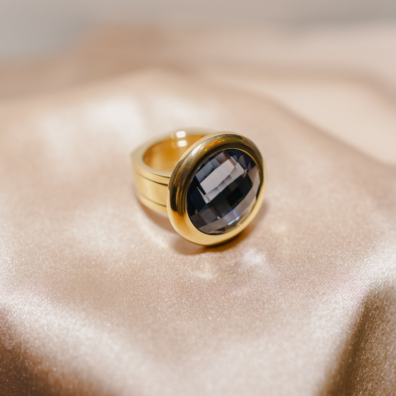 Diseñado en acero inoxidable premium con acabado dorado duradero y detalles cristalinos que capturan la luz. Tamaño 8, cómodo para uso diario, no se oxida.