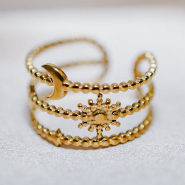 Elegante sortija de acero inoxidable con diseño contemporáneo y chapado en oro, incorpora estructura ajustable que se adapta con gracia natural. Medida: Ajustable para cualquier dedo, resistente al agua e hipoalergénica. La compañera perfecta para quienes buscan una declaración de sofisticación moderna.
