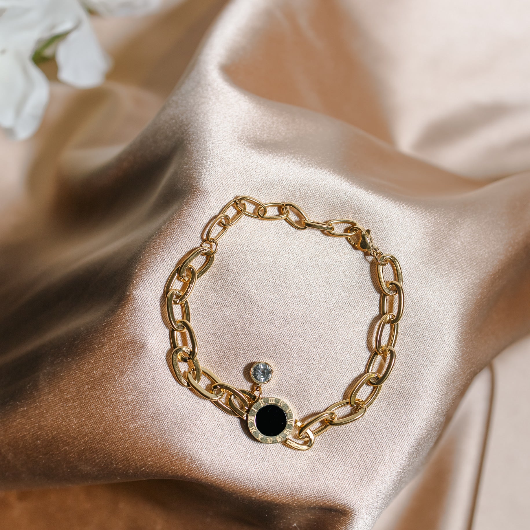 Esta hermosa pulsera dorada brilla con cada movimiento y resalta tu belleza natural. Hecha de acero inoxidable con chapado en oro, mide 19.5 cm de largo y 0.8 cm de ancho - el tamaño perfecto para el día a día. Las circonitas cúbicas le dan ese toque especial que buscas. Además, es resistente al agua e hipoalergénica, la compañera perfecta para quienes buscan estilo y comodidad.